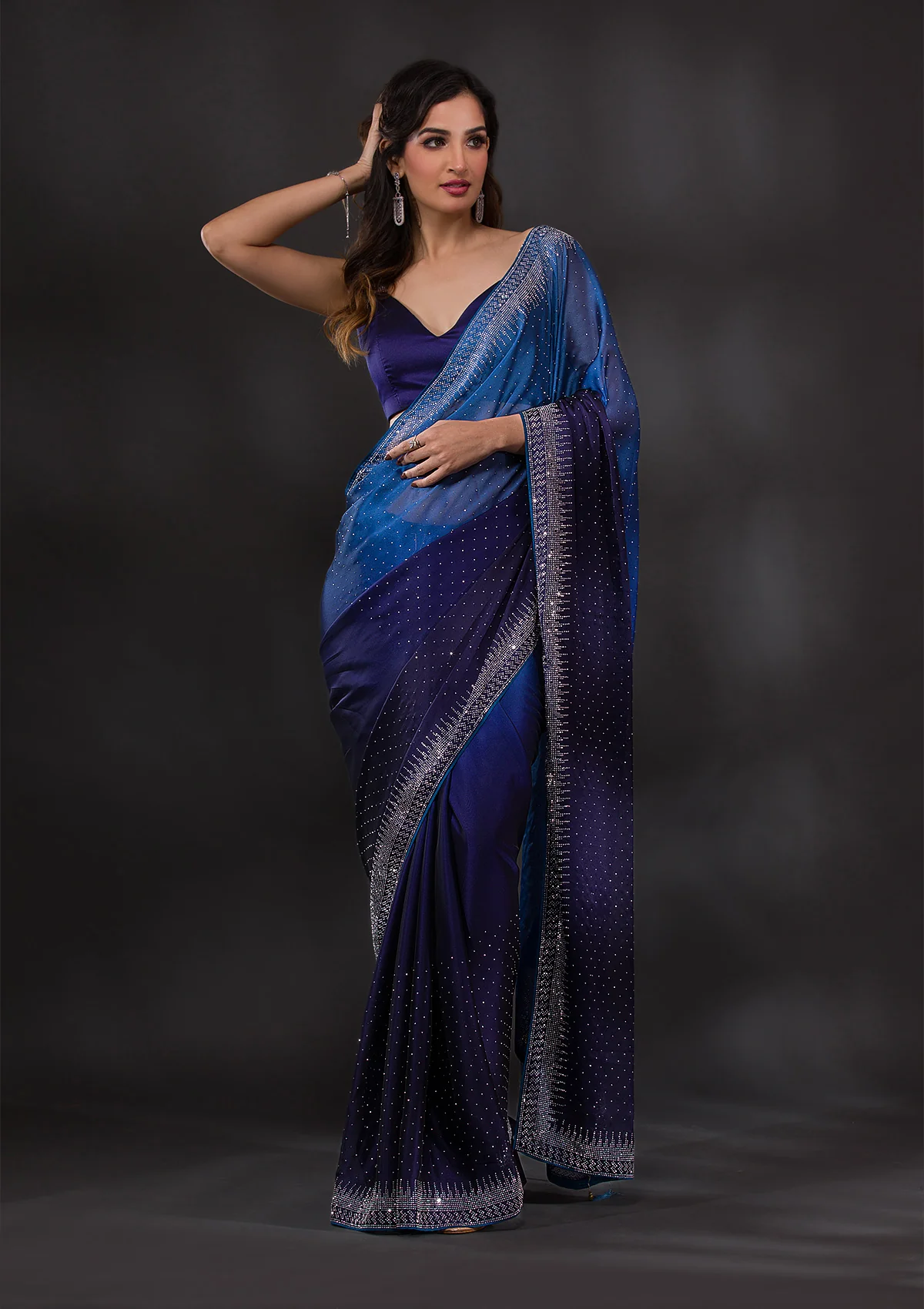 Ombre Navy Blue Stonework Satin Designer Saree