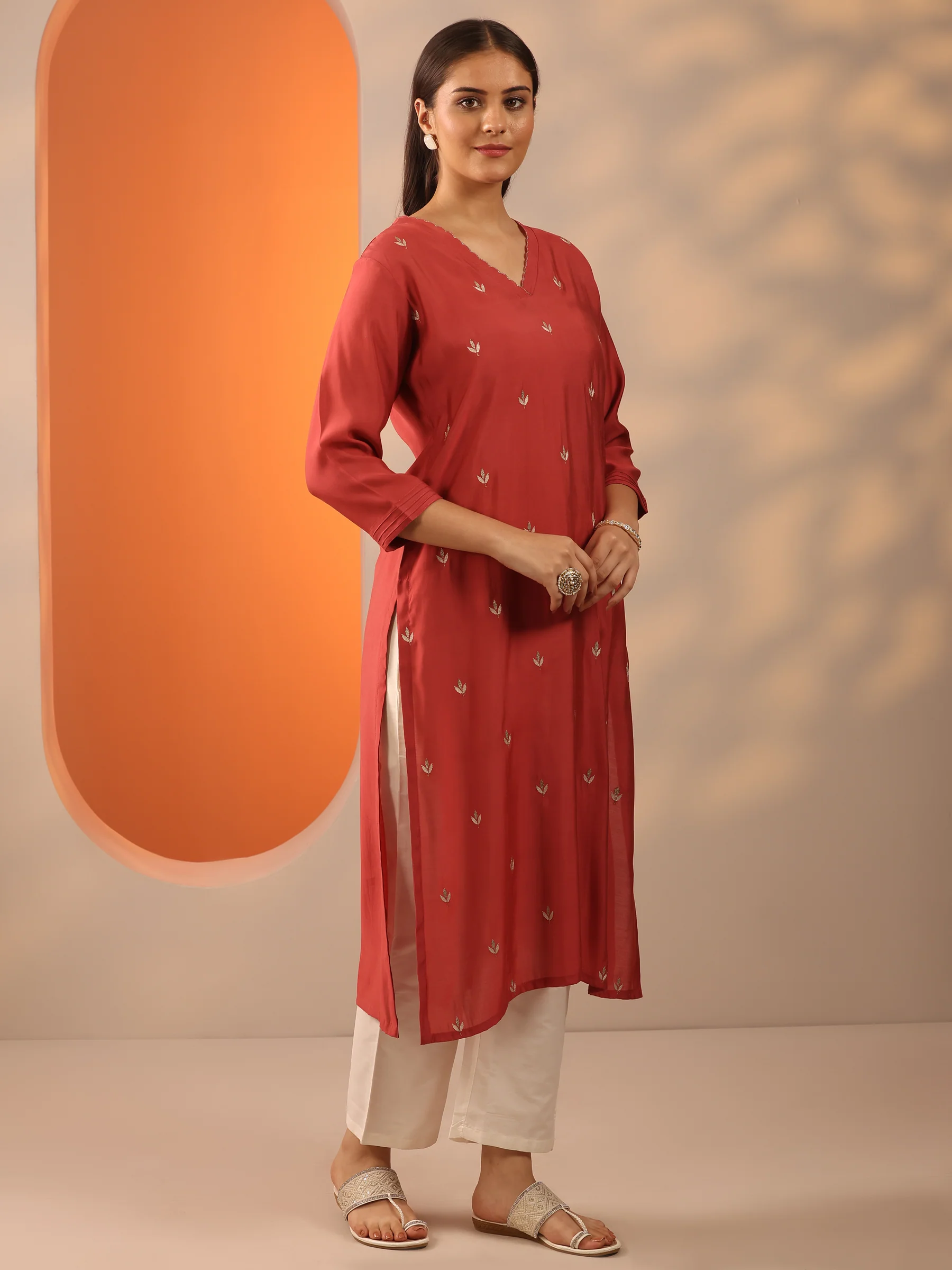 Rust Embroidered Silk Blend Straight Kurta